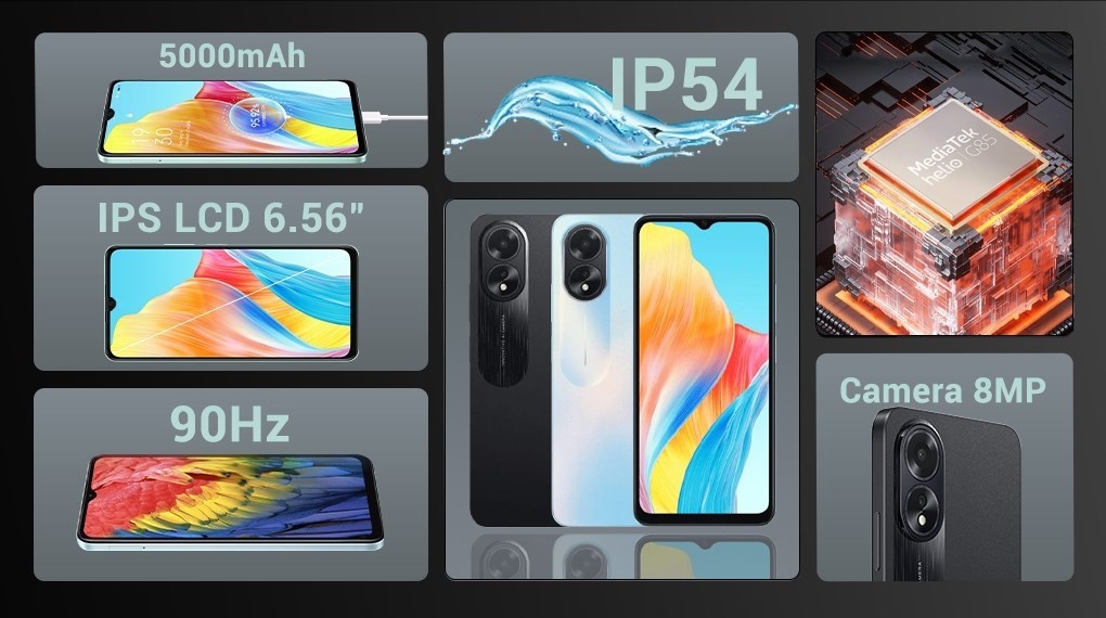 OPPO A18 không chỉ ấn tượng về thiết kế, mà còn được kháng nước và bụi chuẩn IP54, đảm bảo rằng bạn có thể sử dụng điện thoại trong môi trường ẩm ướt hoặc bám bụi mà không cần lo lắng về hỏng hóc.