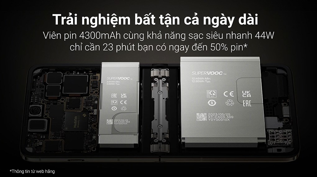 OPPO Find N3 Flip đã tận dụng không gian bên trong để tích hợp viên pin lớn một cách thông minh, mà không làm ảnh hưởng đến thiết kế mỏng và sang trọng của chiếc điện thoại này. Việc này giúp cho OPPO Find N3 Flip không chỉ là một thiết bị mạnh mẽ mà còn là một chiếc điện thoại đẹp mắt.