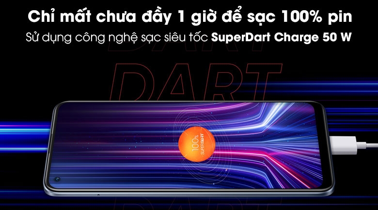 Cùng với đó là công nghệ điện thoại sạc nhanh SuperDart Charge 50 W, chỉ trong vòng khoảng 47 phút để sạc đầy 100%, một kết quả sạc rất ấn tượng mà bạn sẽ khó lòng tìm thấy trong phân khúc tầm trung.
