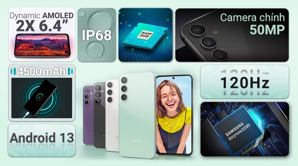 Samsung tiếp tục chinh phục thị trường điện thoại thông minh với phiên bản Samsung Galaxy S23 FE 5G mới. Mẫu điện thoại này được định hình là sản phẩm cận cao cấp với những điểm nổi bật có thể kể đến như: Cấu hình mạnh, camera 50 MP có khả năng quay video 8K đi cùng màn hình 120 Hz.